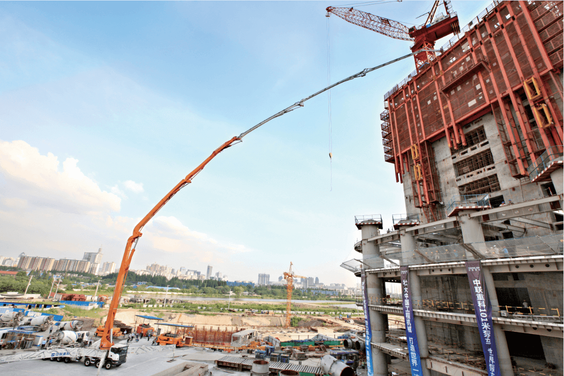 ▲中聯(lián)重科101米超長臂架碳纖維泵車在武漢中心施工