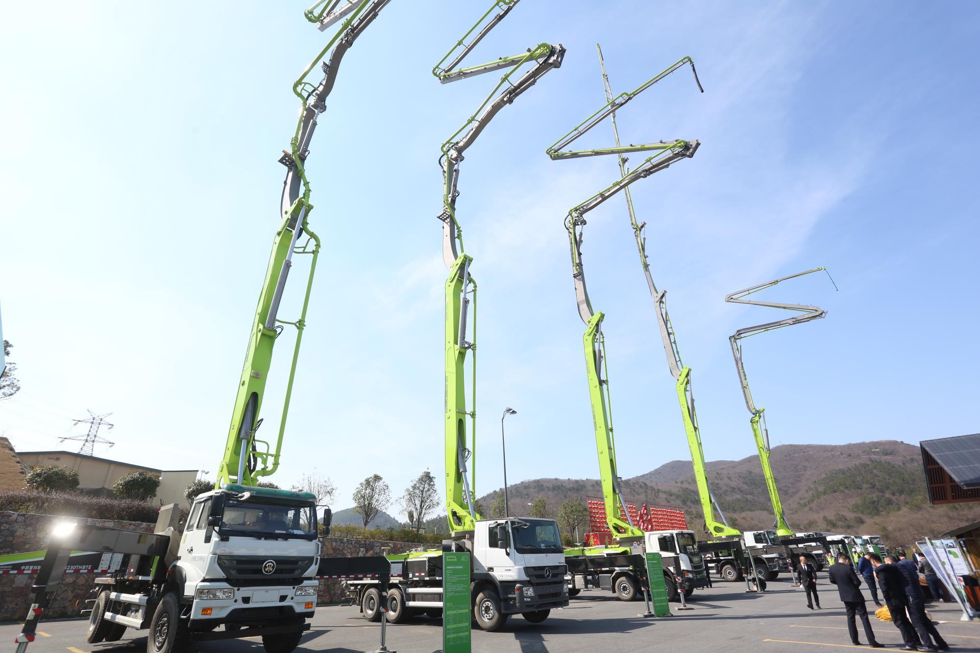 在巡展南京站產(chǎn)品展示區(qū),中聯(lián)重科十多款4.0混凝土泵車、車載泵、攪拌運(yùn)輸車產(chǎn)品一字排開,泵車臂架或在空中擺成“Z”形,或直指蒼穹,組成了一道亮麗的風(fēng)景線。