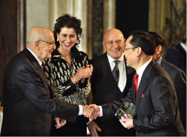 ▲意大利前總統(tǒng)納波利塔諾為中聯(lián)重科詹純新頒發(fā)“萊昂納多國(guó)際獎(jiǎng)”