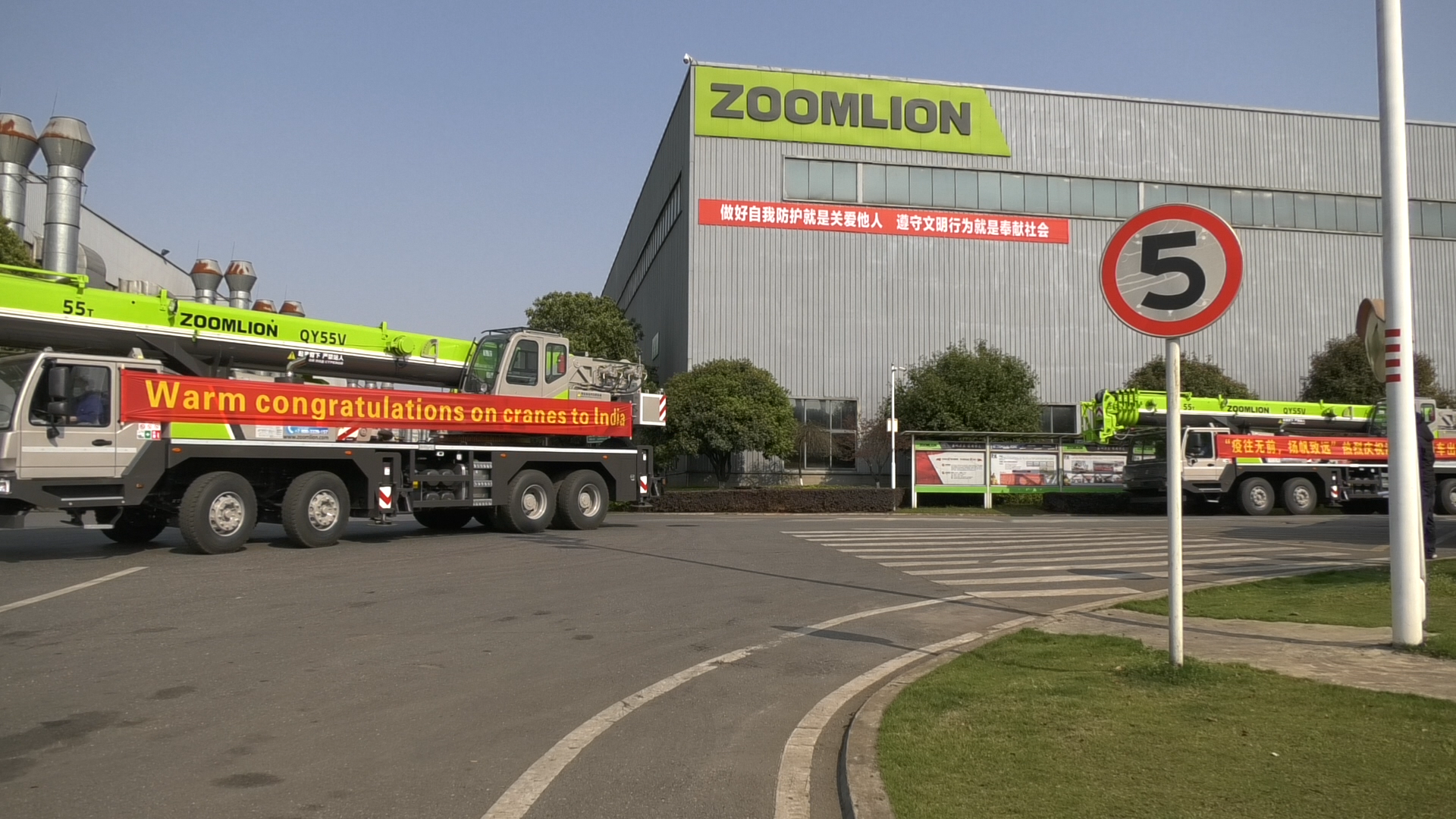 “Green Manufacturing, for a better tomorrow”,在中聯(lián)重科泉塘工業(yè)園,一輛輛身披中英文紅色條幅祝福語的汽車吊、履帶吊魚貫而出,首尾相接酷似一條極光綠長龍。它們或奔赴國內(nèi)大江南北,助力各大項目工程;或開赴碼頭發(fā)往海外,為全球各地的建設(shè)添磚加瓦。