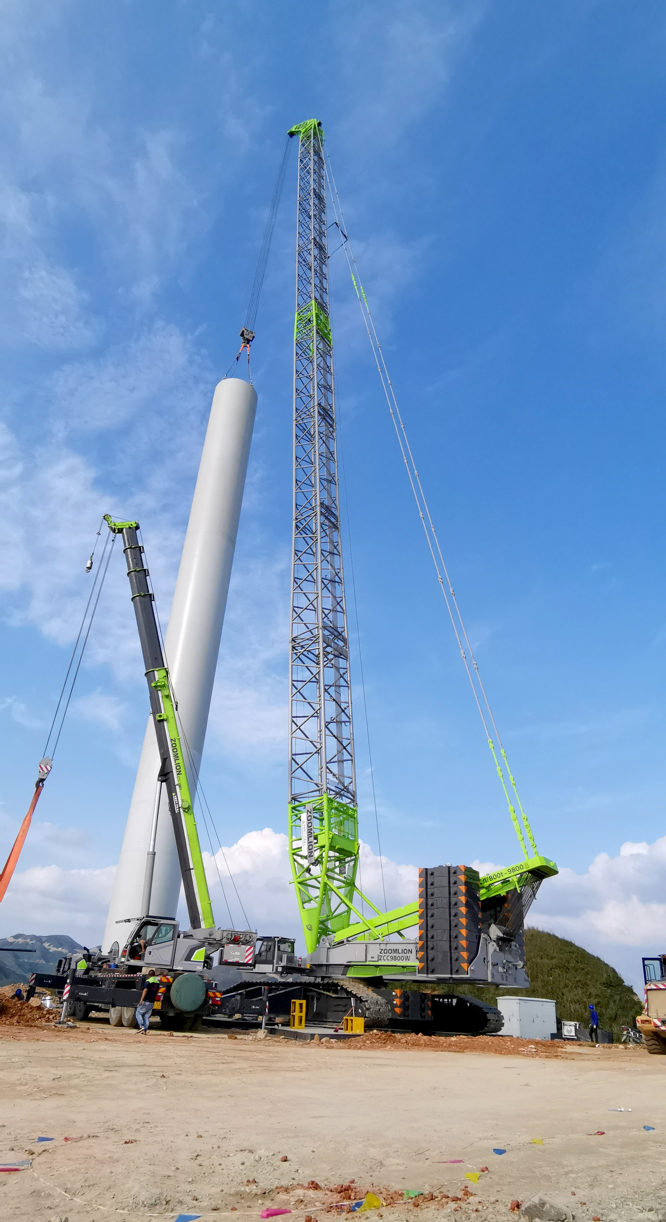 在施工現(xiàn)場,ZCC9800W履帶起重機采用150米超起加強臂+7米風電桿頭工況,完美滿足該項目的吊裝要求。ZCC9800W履帶起重機先從運輸車上將塔筒緩緩吊起,然后翻身將塔筒豎起來,吊至安裝點后便完成了風電機組的吊裝任務(wù)。據(jù)現(xiàn)場跟車服務(wù)工程師李杰介紹,整個吊裝過程平穩(wěn)且順利。履帶起重機在吊裝風電機組時會受到天氣條件的影響,看似晴空萬里的好天氣,但是風速過大會直接影響產(chǎn)品吊裝時的穩(wěn)定性,增加施工難度。這也是對產(chǎn)品性能和產(chǎn)品質(zhì)量的重大考驗。