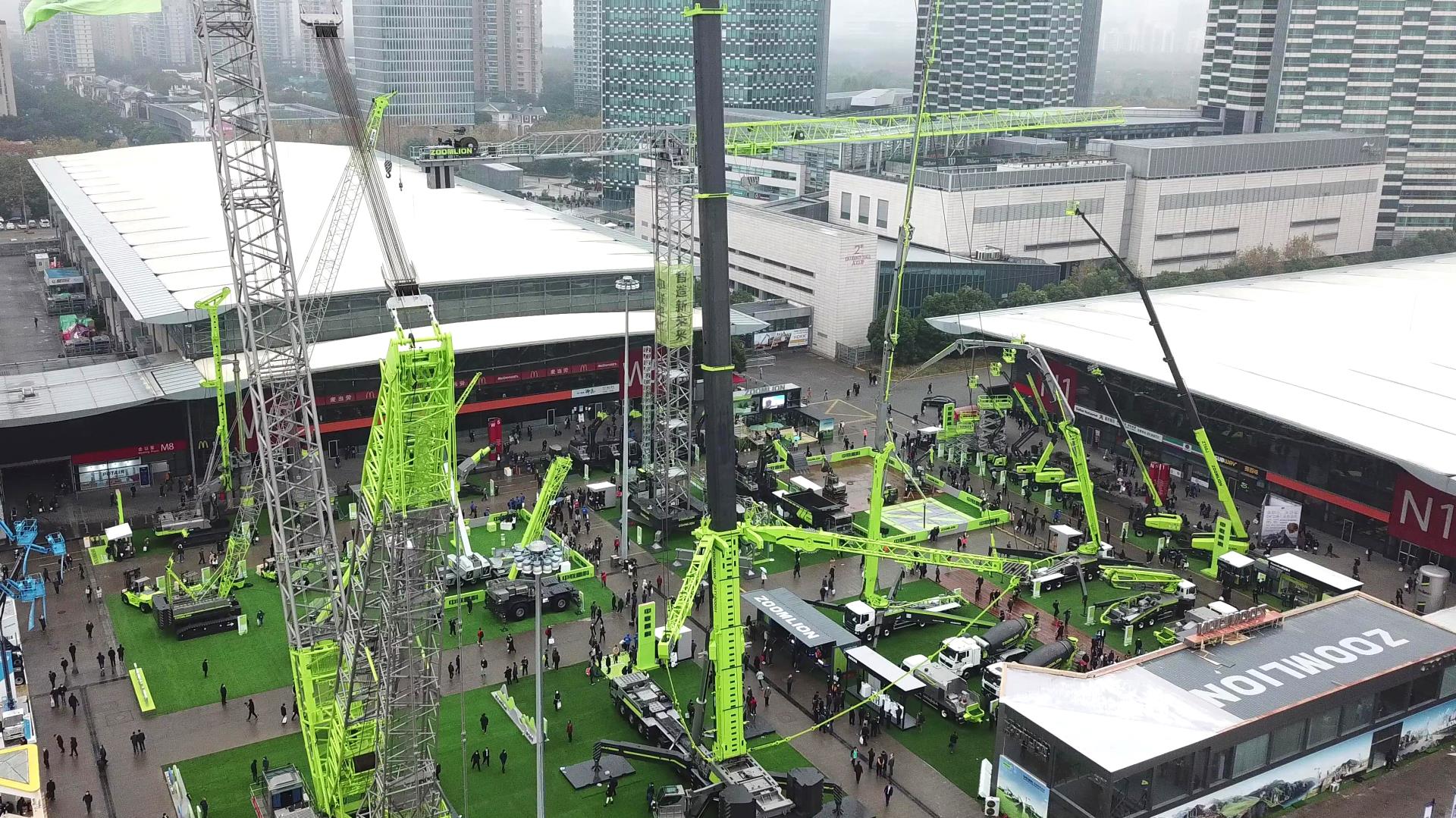 從上海新國際博覽中心3號門進入展場,首先映入眼簾的便是中聯(lián)重科展區(qū),公司工程起重機械、建筑起重機械、混凝土機械、樁工機械、土方機械、高空作業(yè)機械、工業(yè)車輛、m-tec干混砂漿施工設備、礦山機械等9大類產品錯落有致,分門別類擺放在各個展位,50余款產品匯聚成一片“極光綠”的海洋,甚為壯觀。