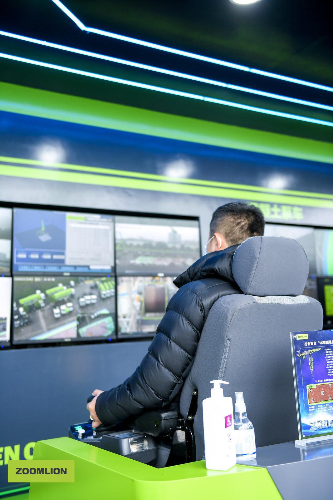 展臺前方,是中聯(lián)重科充滿未來感、前沿感的純電動汽車起重機的智能吊裝演示,以及混凝土泵車動態(tài)演示;展臺右側,則是塔機、泵車、挖掘機設備的5G遠程操控體驗中心,客戶親身的操作、體驗、感受,讓設備的“智能化”功能可觸、可感、可見。