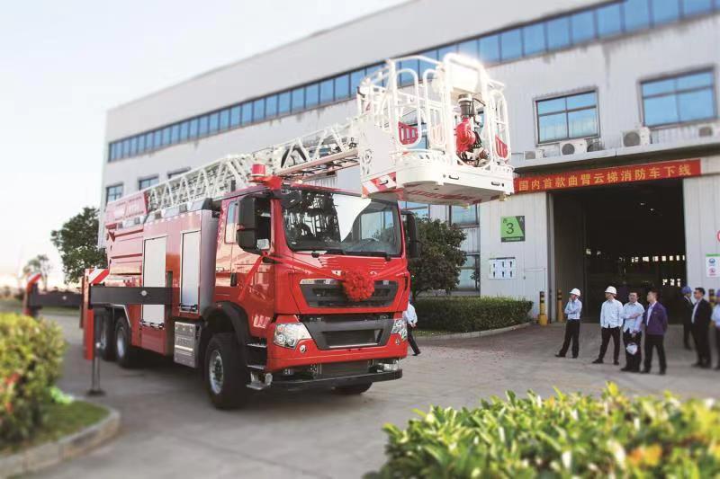 △中聯(lián)重科下線國(guó)內(nèi)首款曲臂云梯消防車