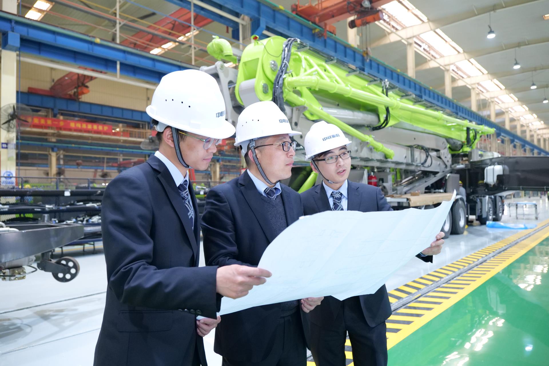 中聯重科混凝土泵送機械分公司研發(fā)中心經理高榮芝(左一)在車間研究泵車裝備。朱莉 攝