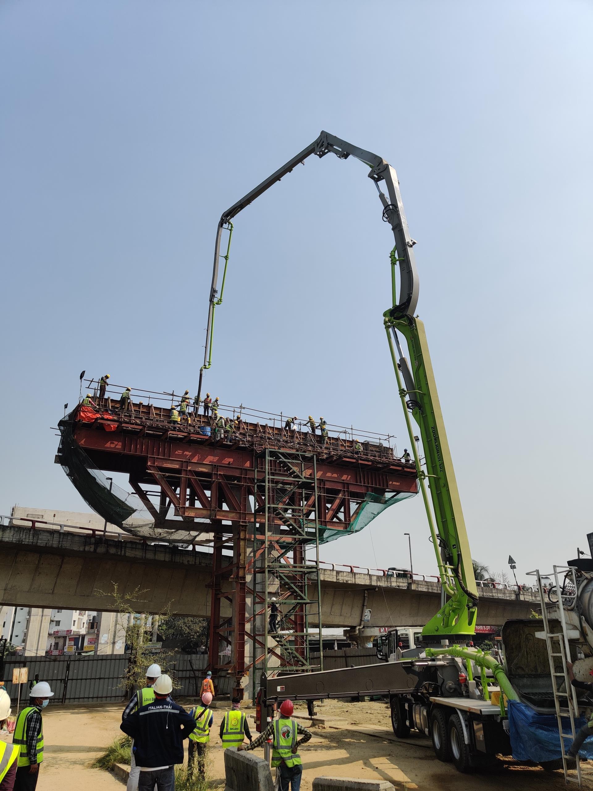 在貫穿孟加拉達(dá)卡市的機(jī)場(chǎng)高架快速路項(xiàng)目上,一臺(tái)全新的中聯(lián)重科極光綠泵車,緩緩打開臂架,伸向不遠(yuǎn)處的高架橋橋墩。施工員確認(rèn)橋墩上工人已部署就位后,等候多時(shí)的攪拌車開始向泵車的料斗放料。隨著泵車發(fā)動(dòng)機(jī)轉(zhuǎn)速的提升,泵車進(jìn)入泵送作業(yè)狀態(tài)。數(shù)十秒鐘過后,混凝土從臂架末端的軟管,精準(zhǔn)、連續(xù)地被澆灌進(jìn)模具。