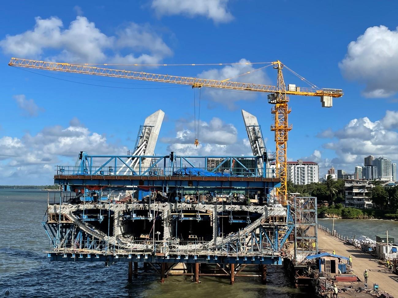 憑借著輕載高速、重載低速的技術(shù),中聯(lián)重科TC7013-10E塔機穩(wěn)定、高效地完成了新塞蘭德跨海大橋橋墩的每一次吊裝。2021年,大橋中塔柱塔頂合龍段混凝土順利澆筑完成,至此,五個主墩塔柱全部封頂。這預(yù)示著中聯(lián)重科兩臺塔機圓滿完成了主要的橋墩吊裝任務(wù),為大橋今年建成通車奠定了堅實基礎(chǔ)。
