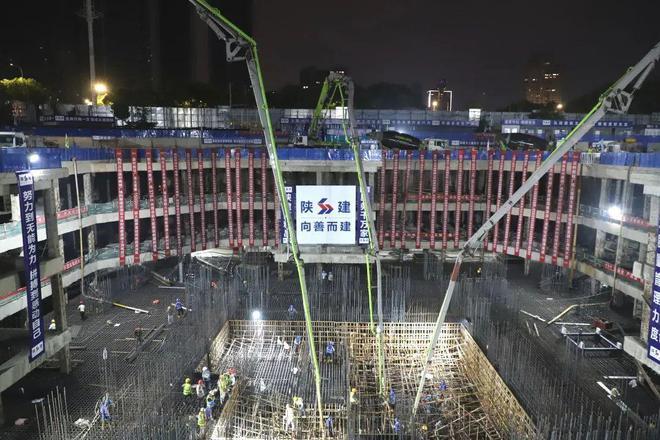 該項(xiàng)目基坑深度近20米,筏板**厚處為7.55米,整個基礎(chǔ)底板澆筑工程采用多點(diǎn)同時澆筑,從中心向四周,由深到淺,斜面分層施工,整體一次完成澆筑。為應(yīng)對跨晝夜深基坑連續(xù)作業(yè),項(xiàng)目方經(jīng)過多方對比,**終選擇中聯(lián)重科設(shè)備承擔(dān)重任。
