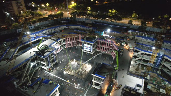 7月31日20時,這場澆筑“車輪戰(zhàn)”正式拉開帷幕。中聯(lián)重科56米、63米及數(shù)臺“凌云Ⅱ”62米泵車,以及三臺22MPa車載泵進(jìn)駐施工一線,面對高溫條件下大體積混凝土澆筑、超70小時深基坑不間斷施工、地下空間狹小等諸多難題,3臺泵車和3臺車載泵同時作業(yè),憑借出色的穩(wěn)定性和可靠性大顯身手,澆筑沖刺階段峰值達(dá)260m3/小時。8月3日20時,“小綠奇跡軍團(tuán)”不負(fù)期待,順利完成**后一方混凝土澆筑。