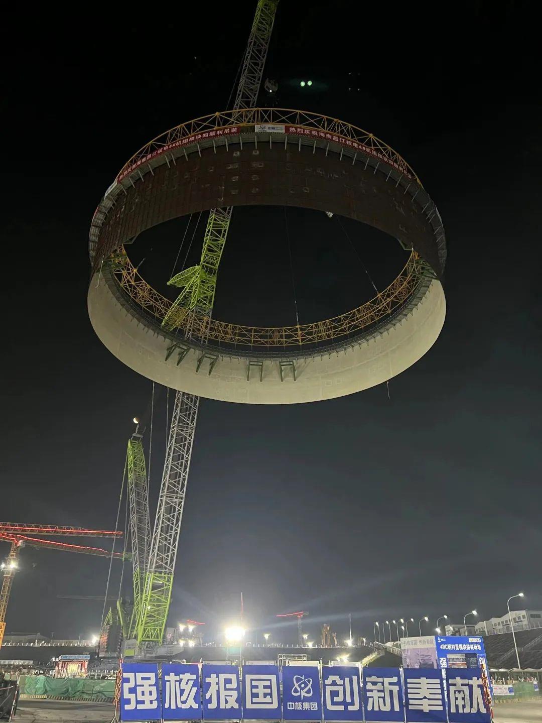 鋼襯里是核電站反應(yīng)堆廠房安全殼的主要組成部分,其吊裝及安裝是核電站建設(shè)中的重要里程碑。此次4號機(jī)組鋼襯里模塊四整體塑型為偏心圓桶,模塊直徑46.8米,整體高度近10米,吊裝總重量約240噸,就位標(biāo)高精度要求為24.935米。