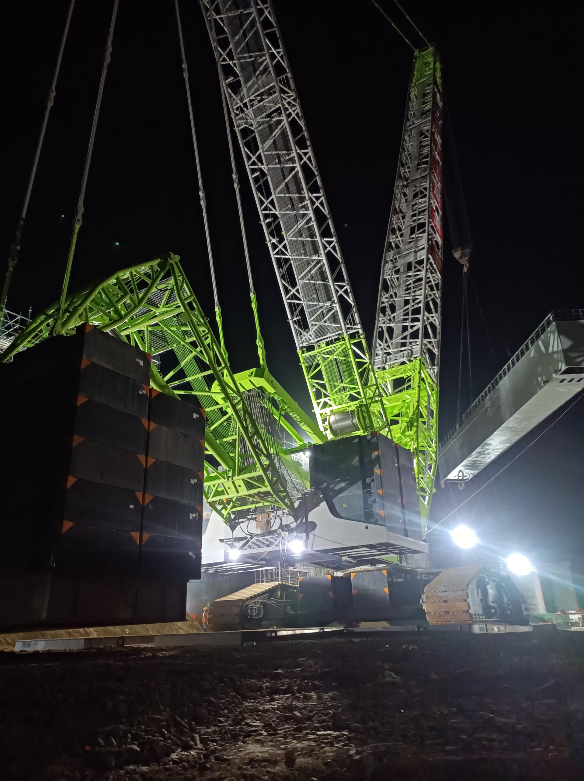 在中聯(lián)重科履帶吊吊裝的鋼橫梁中,有一榀長33.84米,寬4.58米,高3.5米,重達(dá)276.4噸,需要將其吊至離地面18米,相當(dāng)于6層樓的高度,還要平穩(wěn)落在框架墩上,偏差要控制在毫米級,即使風(fēng)力的影響都要嚴(yán)格計(jì)算,做到“繡花”一樣精細(xì)。4月20日凌晨,中聯(lián)重科千噸級履帶吊穩(wěn)穩(wěn)起吊橫梁,旋轉(zhuǎn)、擺正、下落、校正一氣呵成,施工用時(shí)不到30分鐘,贏得項(xiàng)目部高度贊譽(yù)。