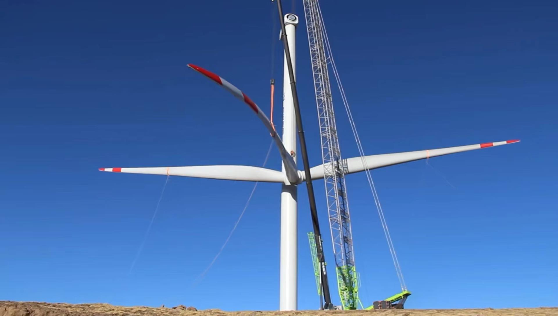 吊裝當(dāng)天,隨著總指揮一聲令下,一陣低沉而有力的轟鳴聲響起之后,首臺(tái)風(fēng)機(jī)的扇葉吊裝作業(yè)正式開(kāi)始。吊裝設(shè)備緩緩上升,在中聯(lián)重科履帶式起重機(jī)和汽車吊順暢的動(dòng)作下,巨大的風(fēng)機(jī)扇葉在空中劃過(guò)一道優(yōu)美的弧線,精準(zhǔn)地安裝在了塔筒頂部機(jī)艙上。