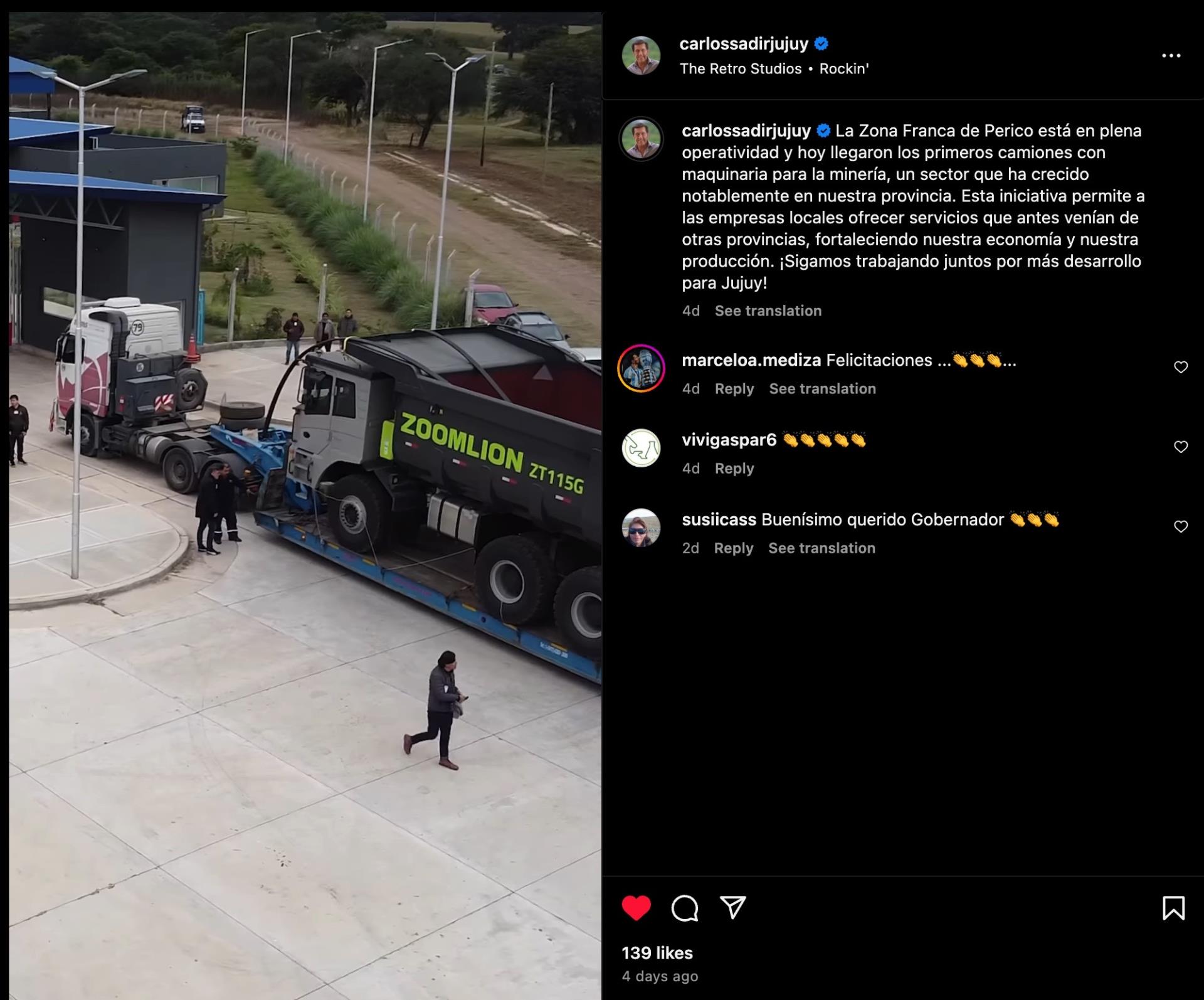 △阿根廷胡胡伊省省長卡洛斯·薩迪爾在社交媒體分享