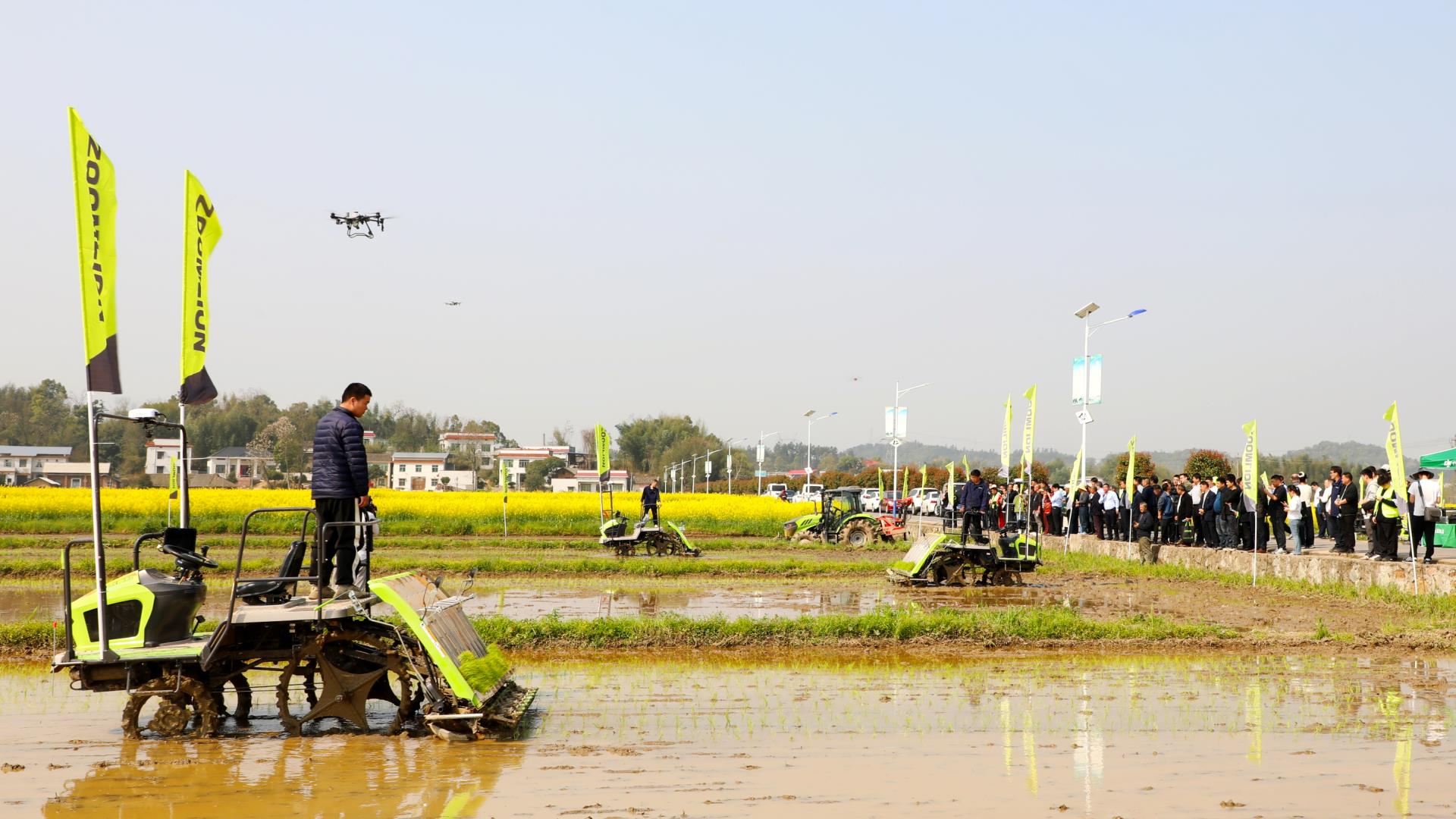 田地間,中聯(lián)重科水田拖拉機和履帶式旋耕機開足馬力開展耕整作業(yè),改善土壤結(jié)構(gòu)與肥力,為后續(xù)水稻種植做好準備;搭載“中聯(lián)智駕”系統(tǒng)的水稻插秧機按照規(guī)劃線路自動行駛,在“北斗”定位技術(shù)的加持下,實現(xiàn)厘米級精準插秧作業(yè),為水稻插秧環(huán)節(jié)提供更智慧的解決方案;中聯(lián)重科植保無人機騰空而起,靈活盤旋在農(nóng)田上空進行施肥作業(yè)?!案⒎N、管”智慧無處不在,助力春耕提質(zhì)增效。