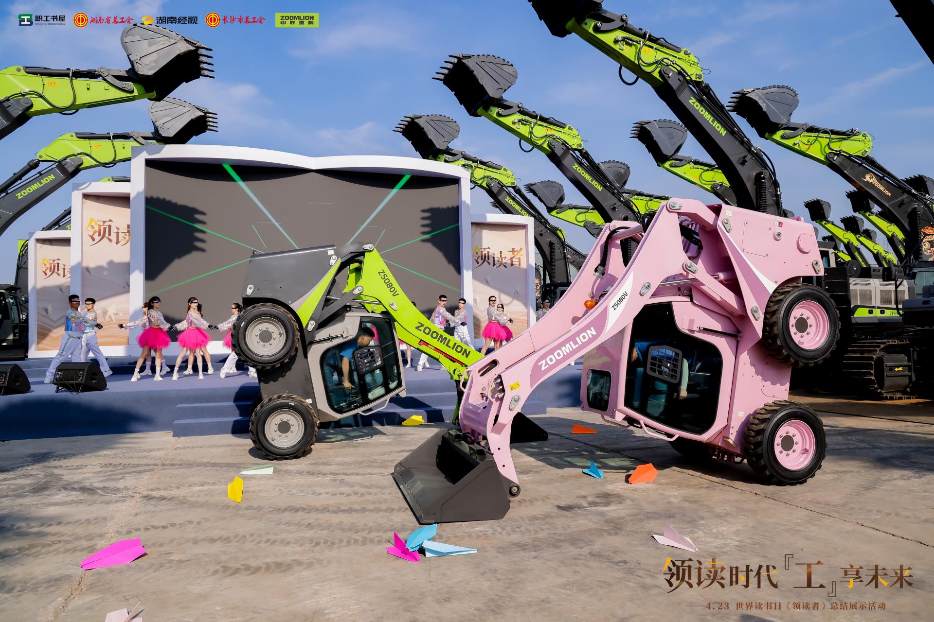 陽光下,中聯(lián)重科智慧產(chǎn)業(yè)城內(nèi),一臺臺挖掘機(jī)整齊排列、環(huán)繞舞臺,展現(xiàn)工業(yè)與科技的結(jié)合之美。中國工程院院士、茶學(xué)專家、湖南師范大學(xué)校長劉仲華,中國作協(xié)主席團(tuán)委員、湖南省作家協(xié)會原主席、作家王躍文,湖南省音樂家協(xié)會理事、知名音樂人袁樹雄,與勞模代表、工匠“領(lǐng)讀者”紛紛走上舞臺,通過書籍分享、情景講述、詩詞吟誦、歌舞表演等形式,呈現(xiàn)一場屬于所有職工的閱讀視聽盛宴。