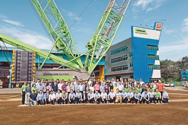 ▲中聯(lián)重科東南亞代理商在QUY650履帶起重機(jī)前合影留念