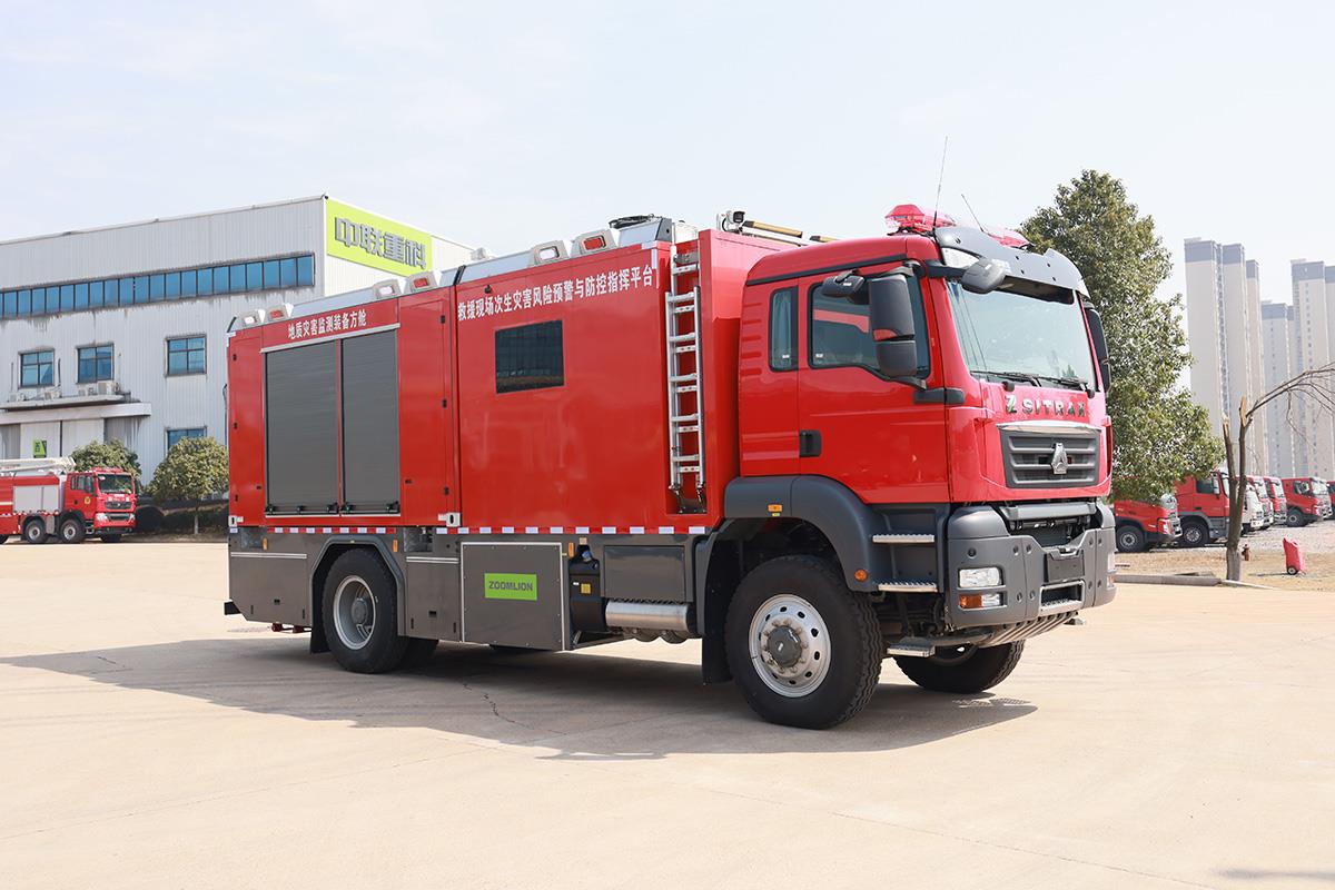 次生災(zāi)害預(yù)警指揮消防車是“十四五”國家重點(diǎn)研發(fā)計(jì)劃“救援現(xiàn)場次生災(zāi)害監(jiān)測預(yù)警關(guān)鍵裝備”。該車采用重汽汕德卡4×4全驅(qū)底盤,搭載森林(草原)火災(zāi)、地質(zhì)災(zāi)害及建筑物火場坍塌三個(gè)功能模塊,一車多用。